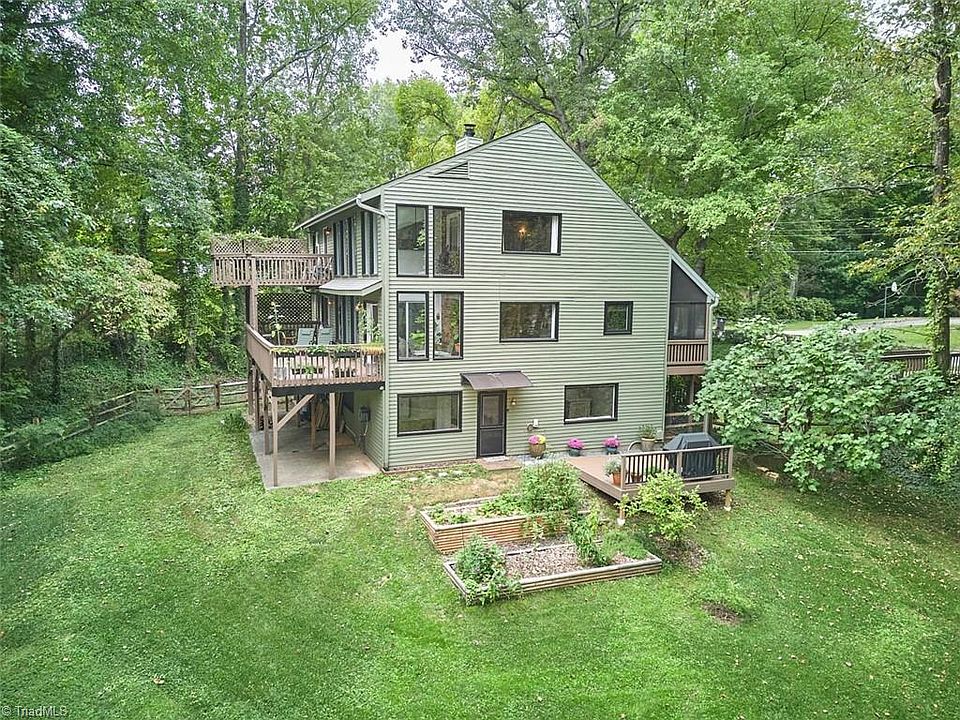 Unique & inspiring 2-story home situated on retreat-like lot within walking distance to WFU & Reynolda Village. The ambiance is set w/vaulted ceilings, gorgeous exposed beams & oversized windows galore. Bright & open floorplan incl. living room w/2-story windows & gas FP, dreamy sunroom, dining room w/a lovely view & kitchen w/soaring ceiling, granite counters & SS appliances. Option for primary on main w/updated ensuite bath. 2 more ML bedrooms w/floor-to-ceiling windows & 2nd full bath. Upstairs find a lovely primary suite w/luxurious bath inc. tile shower, walk-in closet & your own private balcony! Open-air office (or play space) boasts fantastic views of house & yard. Daylight basement is expansive w/laundry setup, exercise & play possibilities! 2-car garage w/workshop space ready for your tools! Peaceful screen porch and massive back deck are ideal for outdoor relaxation. The 0.51 acre lot is flat, fenced & full of scenic features. Live almost on WF campus & close to everything!