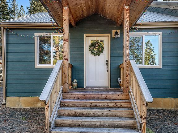 Beautiful five-acre property nestled in the pines and bordering BLM land, offering privacy and access to the outdoors. This 2,412 sq ft home features four bedrooms and three bathrooms with pine accents throughout. The main primary suite includes a sliding glass door to the covered back deck, double vanity, soaking tub, tile shower, and walk-in closet. A second primary suite offers a shower surround and closet with bypass barn doors. Stay comfortable year-round with a Blaze King woodstove and a ducted heat pump. The 1,040 sq ft detached garage/shop includes a concrete floor, insulation, sheetrock, 220 power, and an oil monitor stove. Additional features include a 12′ x 10′ hickory storage shed, fenced backyard for pets, partial perimeter fencing, well, septic system, backup generator wired to the house, and a circular driveway. This property is situated only a few minutes away from town.