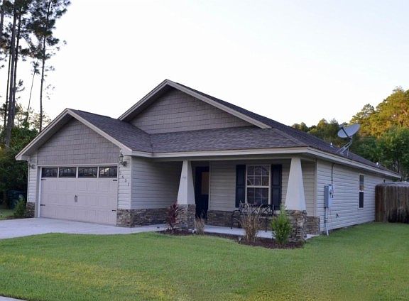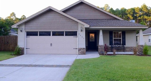 Craftsman style home in the popular Pines of Lynn Haven neighborhood. This 3 bedroom 2 bath, open concept home features tile throughout (except bedrooms) and sits on a nice lot (bigger than most in the neighborhood). Living room is open to the kitchen and dining area. Kitchen offers granite countertops, breakfast bar, stainless appliances, and tile backsplash. Dining area has a beautiful bay window. Master bedroom has 2 walk in closets, trey ceiling, and a master bath with double vanity. This home has an actual laundry room (not a closet or walk through to garage). 2 car garage and more!! All sizes, info, measurements are approx, please verify if important.