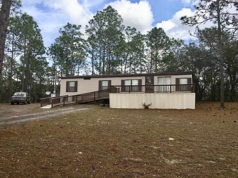 WHY RENT WHEN YOU CAN BUY? This 1989 spacious 3 bedroom, 2 bath doublewide mfg home is in great condition and will not disappoint at this price! Vinyl flooring throughout for easy maintenance, wood shelving in living room and custom wood shelving in kitchen. Nice closet space and indoor laundry area. Large wood front deck with a handicap ramp. All this and more on a nice wooded 1.25 acre lot not far from paved road. Convenient to Ocala and Gainesville.