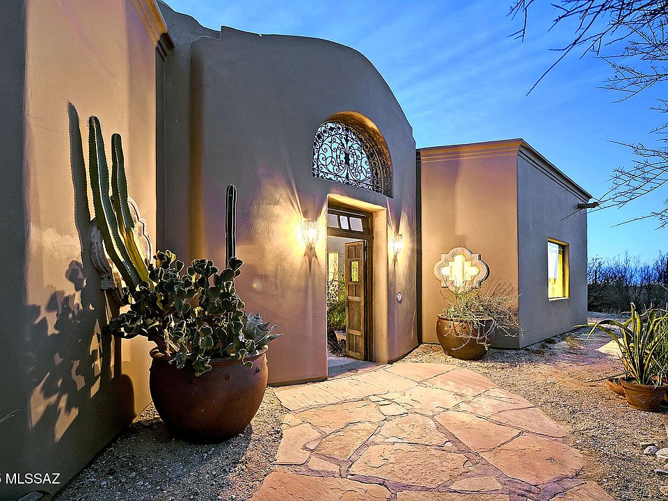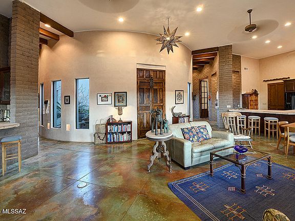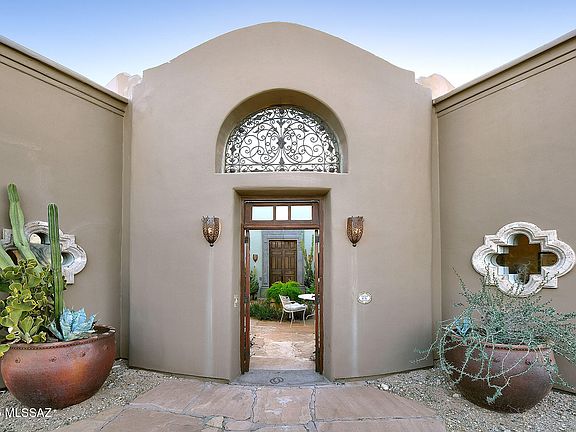 Exquisite Sonoran Desert Retreat - A One-of-a-Kind Masterpiece.Discover the enchanting beauty of Rancho Cielo, a custom-designed 2,783 sq. ft. architectural gem nestled on 3.31 acres of serene desert landscape, with stunning rock work, in northwest Tucson. This exceptional three-bedroom, two-bath home is a true work of art, featuring hand-troweled Venetian plaster interiors, soaring 14-foot ceilings, and expansive picture windows framing breathtaking 180-degree views of the Santa Catalina Mountains.Every detail of this residence exudes craftsmanship and elegance. The open-concept design seamlessly blends indoor and outdoor living, highlighted by custom Knotty Alder cabinetry, Mesquite doors, and high-end kitchen appliances. A spacious office/den, a library with built-in shelving and an adjacent wet bar and a potential 85-square-foot wine cellar offer both functionality and refinement.