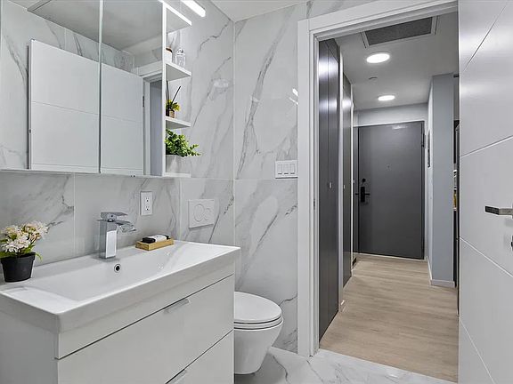 Enjoy contemporary designer interiors and private outdoor space in this stunning, energy-efficient one-bedroom, one-bathroom home at 2654 East 18th Street, a new-construction condominium in the ideal Sheepshead Bay location. Inside this sun-splashed home, discover tall ceilings with recessed lighting, oversized windows and sliding glass doors. The large open-plan living/dining room opens to a wide balcony, perfect for indoor-outdoor enjoyment. Fall in love with the open gourmet kitchen finished with sleek gray and white cabinetry, quartz counters and stainless-steel Samsung appliances, including an electric range, French door refrigerator, dishwasher and built-in microwave. The serene bedroom features abundant closet space, and the modern bathroom is finished with floor-to-ceiling large-format tile, a soaking tub/rain shower, two-stage commode, spacious vanity and medicine cabinet, all trimmed with contemporary chrome fixtures. Radiant heat flooring throughout the entire home, central air conditioning, upgraded insulation, sound-attenuating windows, A/V prewiring, ample closet space and in-unit washer-dryer hookups add comfort and convenience to this pristine new Brooklyn home. 2654 East 18th Street offers intercom entry, a common roof deck, top-floor gym, a bike room and on-site garage parking spaces available for purchase. From this wonderful location, you're close to fantastic waterfront outdoor space along Sheepshead Bay, Coney Island, Manhattan Beach and Marine Park. Enjoy great local shopping, dining and nightlife, while B and Q trains, excellent bus service and nearby parkways put the rest of the city within easy reach.