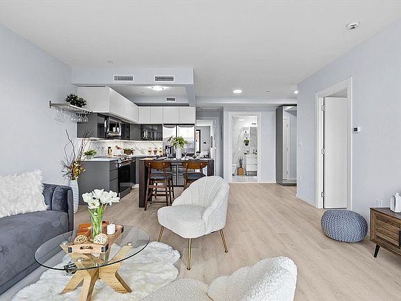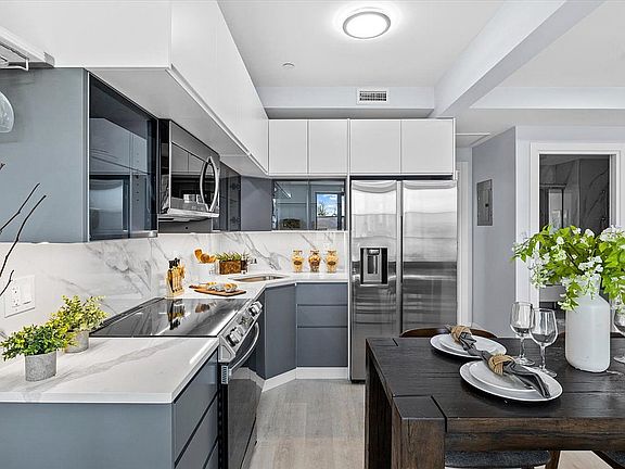 Inside this sun-splashed home, discover tall ceilings with recessed lighting, oversized windows and sliding glass doors. The large open-plan living/dining room opens to a wide balcony, perfect for indoor-outdoor enjoyment. Fall in love with the open gourmet kitchen finished with sleek gray and white cabinetry, quartz counters and stainless-steel Samsung appliances, including an electric range, French door refrigerator, dishwasher and built-in microwave.