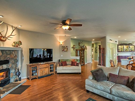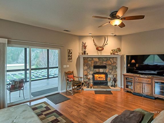 Well designed home with open style living, park-like grounds and river frontage on over 3 acres. Home features contemporary living with main area opening to screened-in covered patio with views overlooking yard and beyond. Cooks kitchen with amazing amount of counters and storage spaces includes floor to ceiling cabinets, display built ins, a large center prep island, and sunny dining area. A more formal dining area is combined with the living room that creates a great room with river rock framed fire place, south facing windows for natural light and views. Serene master suite with north facing views of the alps, fully screened porch access and large walk-in closet. The master bath includes separate shower, a jacuzzi tub, and 'private loo'. Lower level is large enough for pool tables, craft set ups, and entertainment center that includes french doors leading to a sizable stamped concrete trellised patio and fire pit. Grand 40 X 60 foot metal garage will delight any car enthusiast or whoever may desire even more storage area! Style and function are combined for the ultimate 'Trinity' lifestyle.