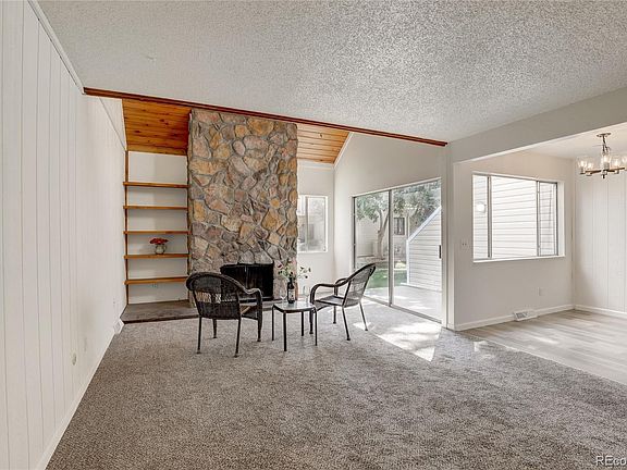 Carport...Charming townhome style condo freshly painted, new carpet, flooring, bright & sunny. 2 primary bedrooms. Upstairs loft bedroom with ensuite, new white vanity, 2 closets include a huge walk-in & additional attic storage. The loft overlooks the wood-burning 2 story rock fireplace in the living room below. The deck, off the bedroom, has a view of the clubhouse & one of the 2 outdoor swimming pools. A 2nd primary bedroom on the main level has a ceiling fan & adjacent full bath. Perfect for a roommate or bedroom plus office. This open, airy layout has a living room that is open to a dining area & updated kitchen complete with new bright white shaker style cabinets and a walnut color butcher block countertop. There is a patio, off the living room. The kitchen includes black appliances, a fridge, stove & dishwasher plus a new stainless-steel microwave. Washer/Dryer Hookup. Home is in a quite cul-de-sac. No Hwy noise. One lighted carport space & additional visitor parking nearby. Convenient access to I-225, Nine Mile RTD, light rail systems & Heather Ridge Golf course. Easy access to CU Anschutz, Childrens Hospital, VA Hospital & Aurora Medical, DTC. New Roof 2016, patrolled by Brownstone Security.