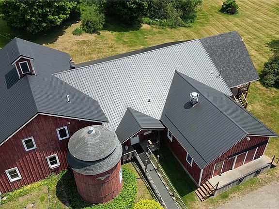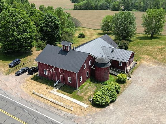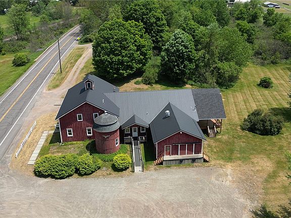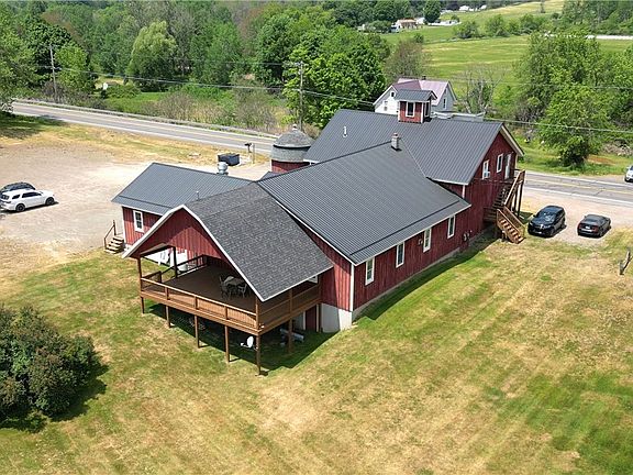 Open your dream upstate business, and live in or rent out the residential space! This completely renovated and immaculately maintained historic barn offers truly endless possible uses - from event center to bar/restaurant or cidery/brewery/distillery, club organization or expansive residence. The structure (historic barn plus 1992 addition) has ALL the updates - 40 yr metal roof (2022), 6" spray foam insulation in walls and ceilings, newer Anderson windows, and updated heating systems (oil furnace+propane space heat+electric radiant upstairs). Event spaces include the 1750 sq ft front banquet room (with half bath, fire wall and roll-down fire door), the 2250 sq ft dining room with horseshoe bar, commercial kitchen, heated loading dock room, full basement with laundry, storage, roll-up garage door, and space for production, and the 20x30' covered back deck overlooking the Susquehanna Valley and tranquil 5 acre parcel. The facility has parking for 75 cars, and even has 3 mobile or small-house lots for rent (additional guest quarters!?). The residence space is an open concept 1750 sq ft, 2 bed 1 bath area with distinct functional sections, tall ceilings, and historic character.