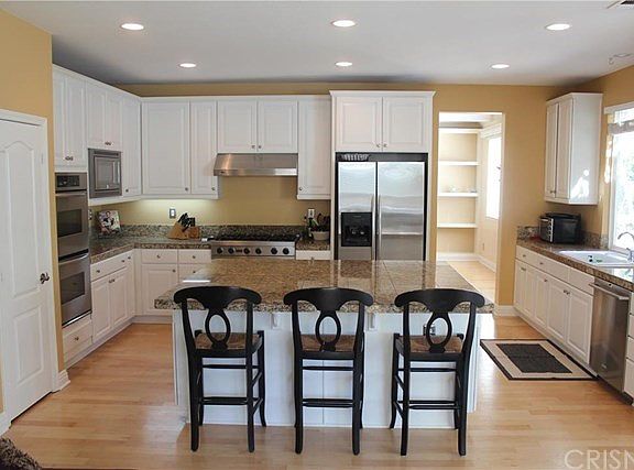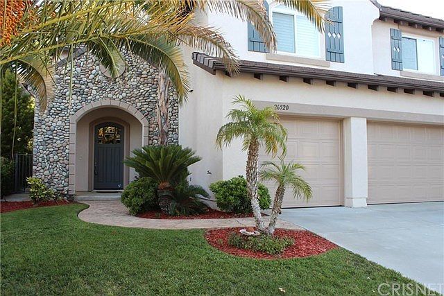 Welcome to this Stevenson Ranch 5 bedroom entertainer's pool home boasting over 3700 sq.ft. of living space at the top of the Ranch. This "Rare" 5 bedroom home features ALL bedrooms upstairs (people have converted 3rd car bay of garage into a 6th bedroom or office) perfect for the large family. One of the secondary bedrooms has it's own bath for that teen or in-law. Everything is spacious about this home. The Master suite has a large bedroom area and 2 big walk-in closets. You will do most of your living and entertaining in the combination of the open kitchen with a humongous center island counter, the bonus/sun room and family room area. The kitchen features granite counters, large walk-in pantry, 6 burner Viking stove and ton's of cabinet space. The backyard features a beautiful pool and spa with cascading water coming from the rocks and slide. There is also a large grass yard with an area for a swing set. The side yard features a built-in BBQ and eating area with direct access through double doors into the breakfast area. There is an extensive use of baseboards and crown moldings which compliments the formal dining room. There is a 3 car sidexside garage with direct access into the home. Solar power! Great schools and neighborhood!
