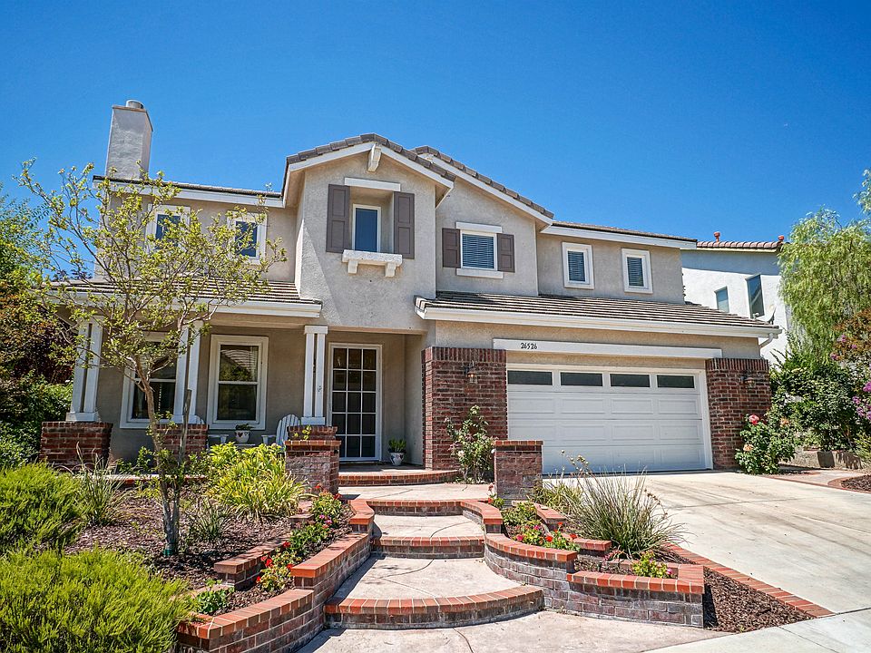Beautiful Centex Heights home located in Stevenson Ranch featuring 4 bedrooms w/ master retreat (all up), 3.5 baths (1/2 bath down), an office nook, and 3 car garage. This home boasts OWNED SOLAR, vaulted ceiling entry, wood floors, raised baseboards, plantation shutters, custom built ins, ceiling fans, two fireplaces, recessed lighting, large bedroom size, and shows light and bright throughout. The upgraded kitchen has lots of white cabinetry, huge center island, spacious pantry, granite counter tops, and stainless steel appliances including a viking stove cook top. The master suite has a large retreat and en suite private bath with walk in closet. Outside enjoy entertaining with your cover patio, sparkling pool & spa, built in BBQ, grass area, and sport court. Stevenson Ranch offers award winning schools, mountain views, shopping, restaurants, and great freeway access!