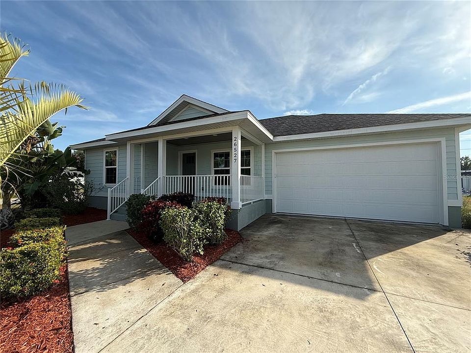 Stunning Punta Gorda Home – Move-In Ready & Priced to Sell! Welcome to this beautifully designed 3-bedroom, 2-bath home featuring a desirable split floor plan and exceptional upgrades throughout. From the moment you arrive, you’ll notice the attention to detail and quality craftsmanship that make this property truly stand out. Step inside to a bright, open layout enhanced by tray ceilings, 5-inch baseboards, and durable ceramic tile flooring that flows seamlessly through the home. The impact windows provide safety, energy efficiency, and peace of mind. The kitchen is a chef’s dream, offering high-end cabinetry, granite countertops, soft-close drawers and doors, striking modern lighting, and a spacious kitchen island that adds abundant workspace and additional seating. Perfect for entertaining or everyday living. The primary suite is a relaxing retreat featuring a walk-in closet and a beautifully tiled walk-in shower. The split-bedroom design ensures added privacy for family or guests. Enjoy Florida living at its finest with a covered front porch and a private screened lanai overlooking the backyard—perfect for morning coffee or evening relaxation. The 2-car garage provides excellent overhead storage for tools, seasonal items, or recreational gear. This home has been meticulously maintained, priced to sell, and is truly move-in ready. Homes like this don’t stay on the market long—schedule your tour today and make 26527 Angelica Rd your new Florida home! ***Seller Finance available with 20% down***