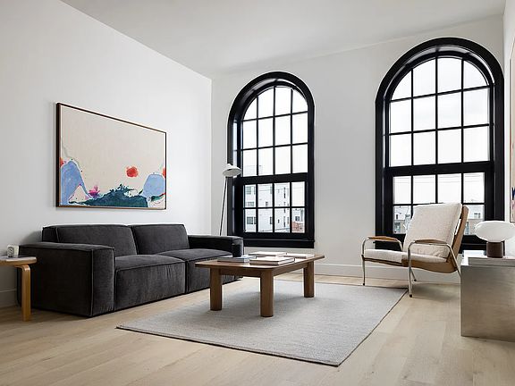 This thoughtfully designed apartment balances simplicity and sophistication, with soft natural light, warm hardwood floors, and dramatic black-framed windows that make every room feel artful yet inviting. The open-concept living area flows seamlessly into a sleek, fully equipped kitchen with move-in ready appliances including a refrigerator, freezer, dishwasher, oven, and microwave.