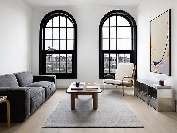 This thoughtfully designed apartment balances simplicity and sophistication, with soft natural light, warm hardwood floors, and dramatic black-framed windows that make every room feel artful yet inviting. The open-concept living area flows seamlessly into a sleek, fully equipped kitchen with move-in ready appliances including a refrigerator, freezer, dishwasher, oven, and microwave.
