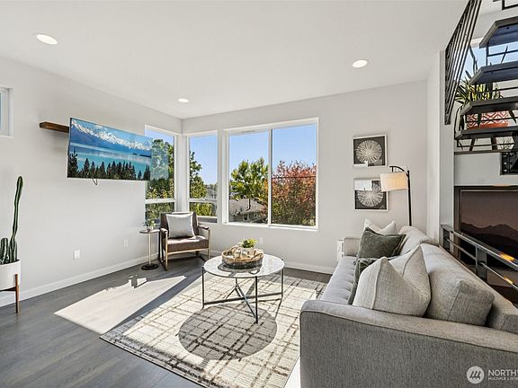 Discover modern living in the heart of Ballard. This light-filled 3-bed, 2-bath townhome sits on a quiet, tree-lined street & features oversized windows, fresh paint, new carpet, & designer-stained oak hardwoods. The entry level offers a welcoming foyer with a custom steel staircase, bdrm, bth, & W/D. The 2nd level hosts a spacious primary suite & add’l 3rd bdrm. Upstairs, enjoy open-concept living with a chef’s kitchen featuring quartz counters, stainless appliances, & ample storage. Radiant floor heating & a Nest smart system add comfort & efficiency. Relax on the large south-facing view deck with sweeping views. Perfectly situated near the Locks, Discovery Park, Golden Gardens, and all the Ballard has to offer!—with designated parking.