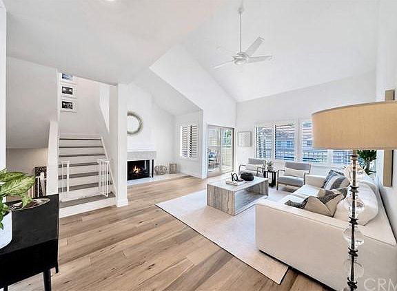 What a fantastic opportunity to own in the highly desired La Mancha Community. This popular Montiel floorplan has 1 bedroom/office and bath on the main floor and two bedrooms and baths upstairs. This beautiful home has soaring ceilings, beautiful white oak flooring, plantation shutters and an abundance of natural light that is carried throughout. The roomy kitchen has been updated with white cabinets, quartz countertops, a farm sink and stainless appliances. The kitchen and dining room look out on the fenced in deck, greenbelt and hillside. The master suite has double door entry, vaulted ceiling and dual closets and sinks and a large soaking tub. There is a 2-car direct access garage and separate laundry room with storage. The community has pools and is part of Lake Mission Viejo. Close to the freeway and low taxes