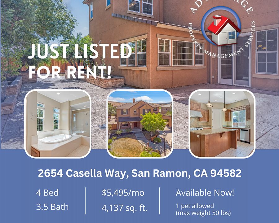 Schedule a Showing Online Don't miss this impressive 4 bedroom, 3.5 bathroom, 4,137 sq ft house off Windemere Pkwy. The home sits on a massive fully landscaped and hardscaped lot in a private cul-de-sac location. The ground level of this spacious home features a large formal living room and dining room space, a separate family room and den, an open kitchen, and one bedroom and full bathroom. The beautiful kitchen comes with a large island, granite countertops, stainless steel appliances, and a pantry for additional storage space. On the second floor are the three bedrooms, including the huge master suite with a sitting area/reading corner, fireplace, and ensuite bathroom that includes dual sinks, a separate tub and standing shower. The upstairs area also offers a recreation room with a built-in entertainment center, and a separate laundry room. The home comes complete with a massive back/side yard perfect for entertaining guests and summer activities, and a 2 car garage with tons of additional space. The neighborhood is within walking distance to several highly rated schools, including Hidden Hills Elementary, Windemere Ranch Middle and Dougherty Valley High, and parks/playgrounds. We are looking for a long-term tenant who will take excellent care of the house. Available for move-in on ASAP Rent: $5,495.00/month Security Deposit: $5,495.00 unless you qualify for our zero-security deposit option provided by Obligo. Applicants that do not meet all the Basic Criteria, but exceed the Minimum Criteria, may be approved with a higher security deposit. If you join Obligo, you will not be required to pay a security deposit! Lease Term: 12 months Pet Policy: 1 pet, max weight 50 lbs with a $500/pet security deposit increase and $30/month pet admin fee. Applicants with pets are required to submit a pet application through a third-party pet screening service at https apms. Refrigerator: Included Washer/Dryer: Hook-ups available Gardening: Tenant responsibility Parking: 2 car garage Utilities Included: Tenants are responsible for all utilities, except garbage Showings are available by appointment only. Schedule a showing online by clicking the Schedule a Showing link. The property is professionally managed by Advantage Property Management Services. Leasing Contact: Harrison Smith (DRE# 01902063) READ THIS IMPORTANT INFORMATION BEFORE YOU SCHEDULE A SHOWING There is a $50/adult non-refundable application fee and ALL adults residing in the property must apply. We will (1) verify your identification; (2) check your credit report, unless you receive a Government Rent Subsidy and request to provide verifiable alternative evidence instead of a credit report no later than when the application is submitted; (3) verify your household income and employment, if applicable; and (4) verify your rental history with previous landlords. Most applications are processed in 2-3 business days from the date we receive a completed application and all supporting documentation. Security Deposits are calculated using a risk-based model. Applicants who meet all the Basic Criteria may be approved at the advertised security deposit amount. Applicants who do not meet the Basic Criteria but exceed the Minimum Criteria may be approved with a higher security deposit, not to exceed the legal maximum. We offer a security deposit-free option for qualified tenants using Obligo billing authorization technology. Security Deposits for active-duty military and properties subject to AB12 cannot exceed 1x the rent. Prior to move-in, proof of a current renters insurance policy with APMS listed as an Additional Interest and coverage of at least $300,000 for personal liability must be provided. Please DO NOT APPLY if your credit score is below 650, your household income is less than 2.5x the asking rent, you have ever been evicted, you have negative rental history, or your pets do not comply with this property's pet policy. If you have a Government Rent Subsidy and elect to provide verifiable alternative evidence of your reasonable ability to pay rent instead of a credit report, you must inform APMS when you submit a rental application. Failure to notify us at this time may disqualify you from participation in alternative verification. We will provide a list of required documentation after we receive a request. All documentation must be provided within 48-hours. Contact us to learn more about this process and the required documentation. All verifiable sources of income will be considered. Pursuant to CA Gov. Code 12955(o), the income multiple is based on the amount of rent that will be paid by the Applicant (not the total rent amount) if the Applicant has a rental voucher or other housing subsidy. To help ensure all residents understand our animal policies, all Applicants must submit an animal application at https apms. All Information Deemed Reliable But Not Guaranteed. APMS is not responsible for content published by third-party listing websites (i.e. Zillow, Trulia, Hotpads, etc). Central Heat/Air Disposal Garbage Service Included New Carpet Pets Allowed Refrigerator Included Views