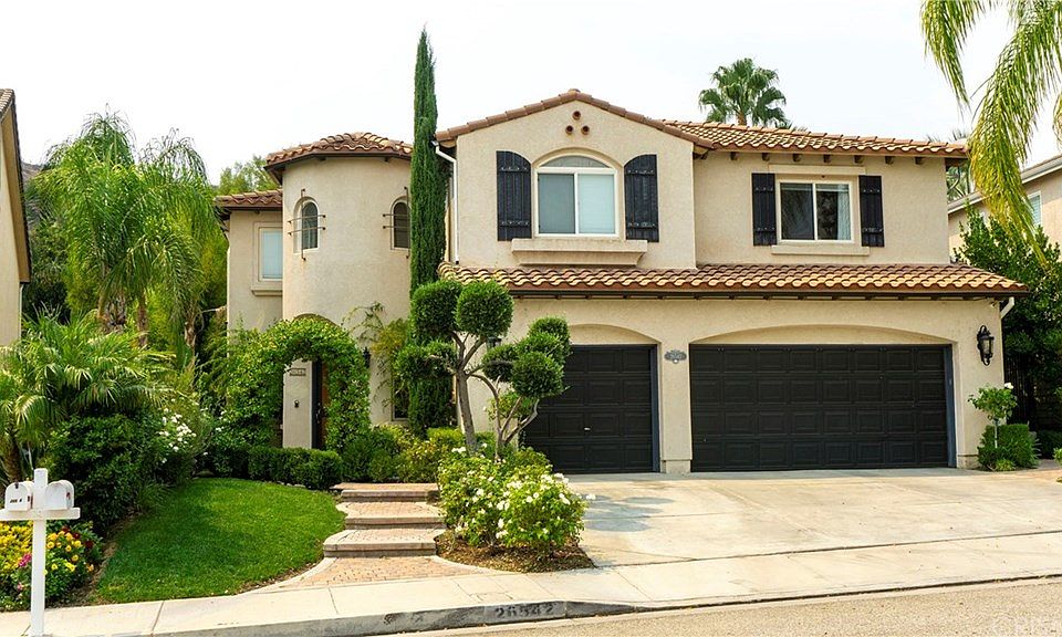 Beautiful POOL and SOLAR home in prestigious Stevenson Ranch! The entertainer's backyard is perfect for staycation. It highlights a heated pool & spa, custom granite top built-in BBQ, tranquil outdoor fireplace, resort-style palapa & cabana, mature landscaping and plenty of space to lounge and play. The elegantly renovated open kitchen boasts a quartz countertop, chic backsplash, large island/breakfast bar, apron sink, Viking cooktop with six burners, stainless steel appliances. Large open family room showcases a stylish stone clad fireplace. There is also a formal living room, and a formal dining room with luxurious RH modern chandelier. Laundry room has ample space and storage. Upstairs you will find the master suite which has a retreat/seating area, double sided fireplace and two separate master walk-in closets. Another bedroom has its own bathroom, and a comfy study alcove. There is an office with built-in cabinets which can be the 5th bedroom. Other features include new cellular shade window coverings throughout, hardwood flooring, newer carpet and paint, lots of built-ins, 3-car attached garage, outdoor pavers. Solar panels are fully paid off. Excellent schools!!!