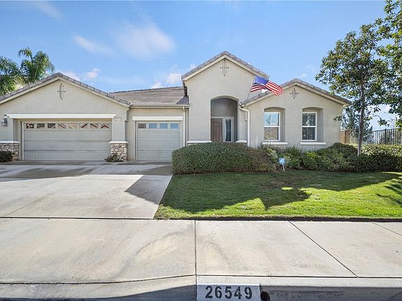 WELCOME HOME to 26549 Rhone Ct., This a stunning single-family home located in the beautiful city of Moreno Valley, California. The home is situated in a desirable neighborhood and offers plenty of space for both indoor and outdoor living. Inside, the home boasts 4 bedrooms and 3 bathrooms spread across 2,661 square feet of living space. The open floor plan creates a warm and inviting atmosphere, with natural light pouring in through the large windows. The living room features a cozy fireplace, perfect for relaxing on chilly evenings. The kitchen is fully equipped with modern appliances, ample storage space, and a convenient island. Adjacent to the kitchen, you'll find a spacious dining area that's perfect for entertaining guests. The primary bedroom is spacious and features lots of closet space and an en-suite bathroom. The three additional bedrooms are also generously sized and share a full bathroom. The backyard is an oasis of tranquility, offering plenty of space for outdoor gatherings and relaxation including a firepit area, covered patio with shade coverings and a built-in BBQ space. The property also features a 3-car attached garage, providing ample parking space and storage. Located in a quiet cul-de-sac, this home offers a peaceful retreat from the hustle and bustle of city life. It's conveniently located near schools, shopping centers, and major freeways, making it an ideal location for both work and play.