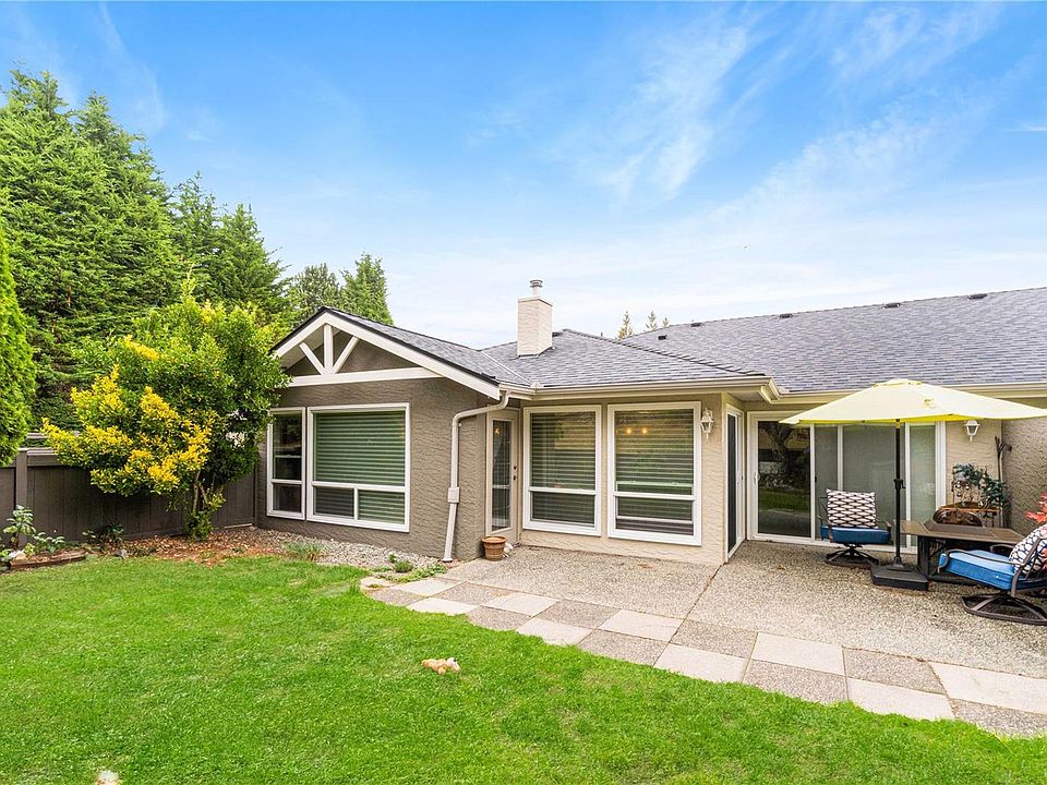 Discover easy living in this bright and spacious 1,685 sq ft patio home backing onto Glen Eagle Park—just minutes from Fairwinds Golf Course, the marina, rec centre, and trails. With 2 bedrooms, 2 bathrooms, and a den, this well-designed home offers a fully fenced yard and two private patios for year-round enjoyment. Vaulted ceilings and southwest-facing windows fill the living/dining area with natural light, while the cozy gas fireplace adds warmth. The kitchen features quartz counters, white cabinetry, tile backsplash, new appliances, and a sunny nook with patio access. Retreat to the primary suite with walk-in closet and a 5-pc ensuite. A skylit den and guest room with private courtyard access add flexibility. Upgrades include quartz counters, concrete sinks, motorized blinds, new carpets, lighting, washer/dryer, and more. Hot water tank (2021). Strata: $436.53/month.