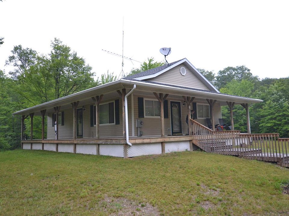 Beautiful home on 10 nicely wooded acres with a view of the pond. Home was built in 2000 and features 2 large bedrooms, 2 baths, full-finished basement with kitchenette, family room, extra sleeping quarters and utility room. Also, a detached heated 28x36 garage and a wrap around covered porch.