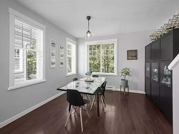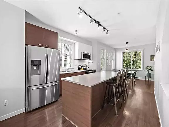 This 3 level End Unit is bright, spacious and offers 2 bed, 2 bath + den. Main has an open floor plan w/spacious layout, kitchen with large island, S/S appliances, laminate flooring and oversized SW facing balcony off living. Lots of bright, natural light from the extra side windows. Privacy throughout the unit, with no neighbours directly across from the home. Up are 2 generous sized bedrooms, a bathroom + ensuite
