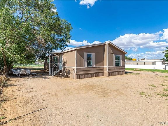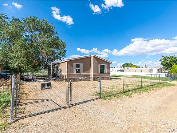 OVER SIZED 100'x100' LOT!! Beautiful 3 bedroom, 2 bathroom with split bedroom floor plan* Double RV gates* Plenty of parking for all the toys** Quality cyclone fencing front and rear yard* More than enough room for all your recreational toys and so much more. ** Home features, quality metal skirting, wood and steel construction & asphalt shingles* Dual pane windows* vaulted ceilings* Central AC/Heat plus a window AC unit for extra cooling in Owners suite as well as fans in the primary and secondary rooms.* Freshly painted interior and exterior of the home** New wood slate vinyl flooring throughout home* Enjoy the spacious living room with ceiling fan and a partially open floor plan*large kitchen with an abundance of cabinets and storage, nice countertops, breakfast bar, dual sided stainless steel sink with view window above* * Dining area off the kitchen with more view windows for natural light to enjoy breakfast in the morning* Spacious owners suite with walk-in closet, vanity with lighting & you can retreat to your own little oasis and enjoy a leisurely soak in your large garden tub/shower combo * 2 spacious guest bedrooms and a full size guest bath are located opposite of the owners side for that added privacy** In-door laundry room** Low cost utilities* Low annual taxes* NO HOA* *Conveniently located a few miles from to restaurants, shopping, medical and more* and YES YOU OWN THE LAND** Call today for your personal tour**. 35 MINUTES TO LAKE MOHAVE, COLORADO RIVER AND LAUGHLIN NEVADA CASINOS* VERY CONVENIENTLY LOCATE* CALL THE LISTING AGENT FOR MORE INFORMATION**