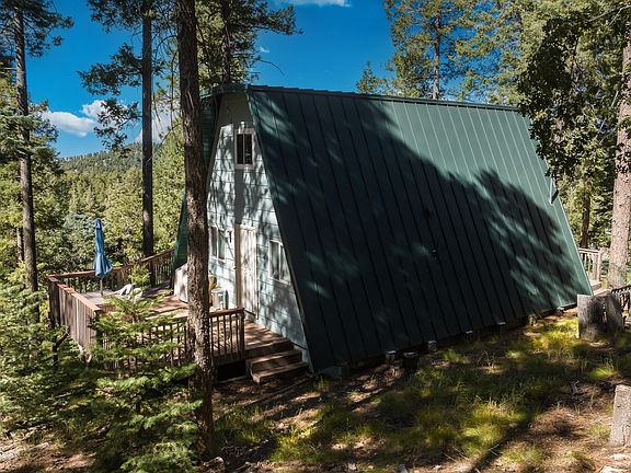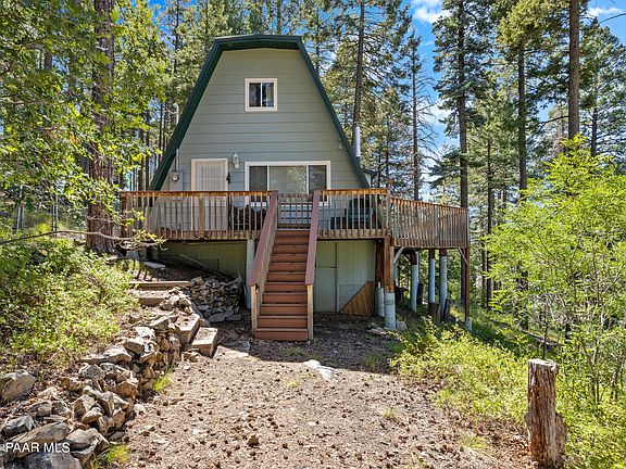 Your perfect getaway awaits . . . New to the market this beautiful A-Frame style cabin in the tall pines offering privacy and great views. This cabin sits on over 2 acres of useable land. The large deck area is a perfect spot to sit outside, take in the beauty of the area and enjoy a cup of coffee. Step inside to an open living room featuring a wood burning stove, a nice addition on the cold mornings/evening. The updated kitchen offers many cabinets and solid surface counters, and a separate dining room area situated just off the kitchen. There are two well sized bedrooms, each with closets providing plenty of storage space. There is one full bathroom. Below the cabin is an enclosed basement area that could be used for storage or a workshop.