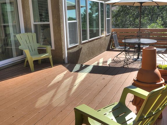 Beautiful well kept home in Peregrine! This property boasts new stucco, triple pane windows, private back deck on a third of an acre. Walk into an open entryway with curved staircase and vaulted ceilings. Large Living and Dining area. Open kitchen with granite counters, huge island and stainless steel appliances. Kitchen flows into the two story Family room with fireplace. . Upstairs the master bedroom has vaulted ceilings and attached 5 piece master bath with amazing city views and large walk in closet. Two additional bedrooms upstairs with walk in closets and Hall Bathroom with double vanities. Ceiling Speakers throughout the home to enjoy music wherever you go. Laundry room on main floor. Three car garage. The walk out basement has a huge finished recreation room, a fourth bedroom and bathroom plus room to expand. An additional one or two bedrooms can be easily added to the basement of this wonderful family home with minimal effort. Solid core wood doors. New light fixtures, ceiling fans and door handles throughout. Enjoy the natural beauty of Peregrine with privacy of scrub oaks and evergreens yet be only a few minutes away from the Interstate for easy access North or South.