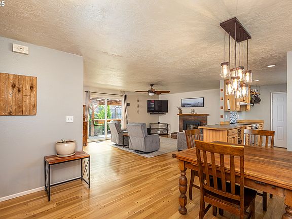 Beautiful 3 bed, 2 bath single level home with NEW ROOF, nestled back in a cul-de-sac in desirable Santa Clara. Charm and character in abundance with stylish wood floors throughout, appealing wood trim details and many other updates including both of the bathrooms. Galley kitchen with stainless steel appliances, including a range hood set above a mosaic-style backsplash, opens into the generous living room with cozy gas fireplace and feature ceiling fan. Primary bedroom has vaulted ceiling, double closets, another feature ceiling fan, plus an exterior door providing easy access to the back yard. Office nook, tucked away in the oversized hallway, makes the perfect spot for working from home. Slider from the living room leads to a generous back yard offering covered patio, hot tub, outdoor eating bar, fire pit, garden area with second patio and RV pad. Garage is a good size, giving extra options for storage. Convenient for the amenities, shopping and restaurants that River Rd has to offer, but giving the sense you are a world away. All this and more, plus LOW COUNTY TAXES!