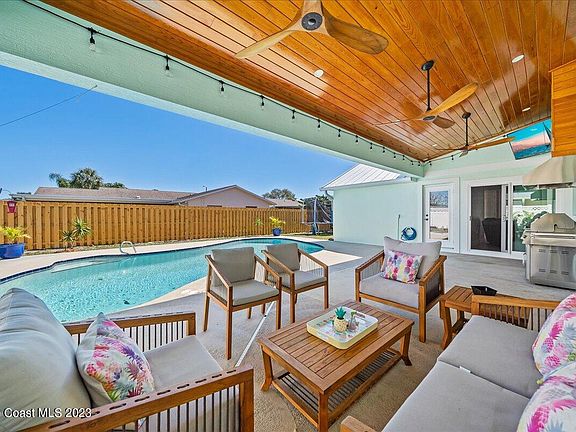 Check out this RARE opportunity to own a beautifully updated 4 bedroom/2 bath POOL home on Merritt Island! Walk in through the cypress-lined foyer to vaulted ceilings and modern updates. The beautifully updated kitchen has a large apron sink, solid wood, soft close cabinetry and plenty of space to utilize the stainless steel appliances. Hurricane impact sliders and windows lead you out to an expansive patio over looking a deep pool with a new pentair pump. Plenty of space to entertain with dual TVs, cypress wood ceilings, fans & Viking grill hood. New metal roof, storage shed, 50/30 amp RV panel and generator switch panel are just a small portion of the upgrades this home has to offer. Inside you will find new interior doors, pine baseboards and gorgeous bathrooms. A must see!