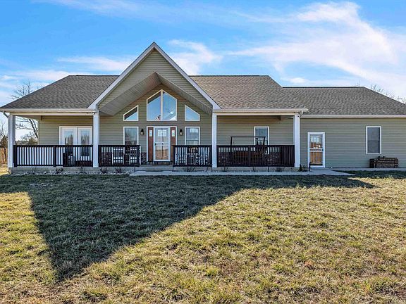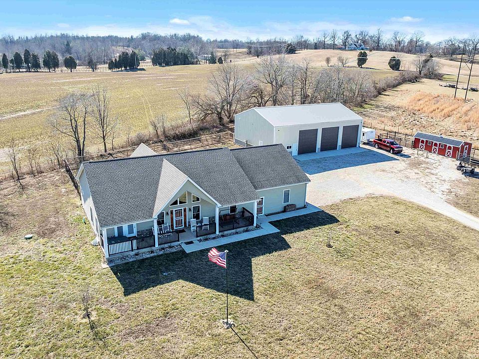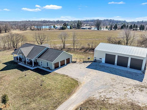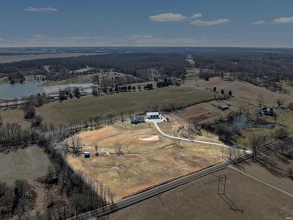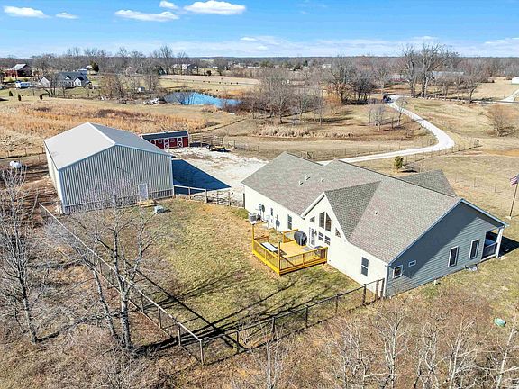 Welcome to this charming countryside home in Boonville, Indiana, offering a peaceful retreat on just over 10 acres of land. This property boasts a variety of amenities, including a 2-horse stall, chicken coop, and spacious pole barn with three RV sized bays. This countryside home also includes an attached 3-car garage, providing convenient parking and additional storage options. This property has 6 fenced-in pastures making it perfect for animal lovers. As you arrive, you'll notice the covered front porch and well-maintained landscaping, creating an inviting atmosphere. Upon entering the home, you'll be greeted by an open floor plan seamlessly connecting the living room and kitchen. The living space features over nine-foot vaulted ceilings an stunning hardwood flooring. Natural light floods the room through the floor-to-wall windows on each side of the house, providing picturesque views of the surrounding countryside. The eat-in kitchen is a chef's delight, offering stone countertops, stainless steel appliances, a kitchen island, a breakfast bar, and ample cabinet space. The primary bedroom is a tranquil oasis, complete with plush carpeting, a ceiling fan, and large windows that provide abundant natural light. The two additional bedrooms offer comfortable carpeting, ceiling fans, and generous closet storage. Completing the interior of the home is another full-sized bathroom with a shower tub combo, as well as a convenient laundry space with cabinet storage and a workspace. Don't miss the chance to own this incredible property with it's peaceful surroundings, spacious interior, and fantastic amenities.