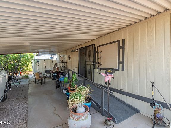 This charming 2 bed, 2 bath mobile home blends space and style with a thoughtful floor plan designed for easy living. The private primary suite offers a walk-in closet and en-suite bath with low-maintenance flooring and a new rain shower head. The living spaces feature a bay window, updated light fixtures, and new ceiling fans. The kitchen includes a newer hood vent, electric stove, breakfast bar, pantry, and dishwasher hookup. Guests will love the cozy bedroom with a reach-in closet and ceiling fan. Enjoy the Arizona room, desert landscaping, new potted plants, new exterior trim, two sheds, a covered carport, and a front door ramp. Updates include a newer thermostat, serviced septic, updated toilet parts, and potential for gas hookup. You get all of this on 0.3 acres of land!