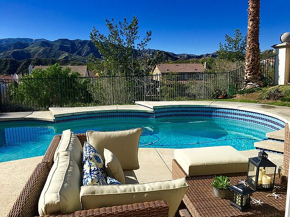 STEVENSON RANCH POOL HOME WITH VIEWS OF HILLS!!! Private yard at the top of the street. Good sized kitchen, family room with granite island and back-splash, tile in entry and kitchen. Open floor-plan with full bedroom with attached bathroom downstairs plus half bathroom downstairs, four bedrooms and laundry upstairs.