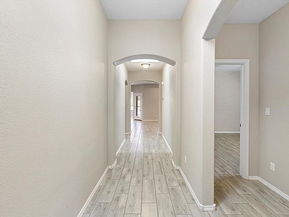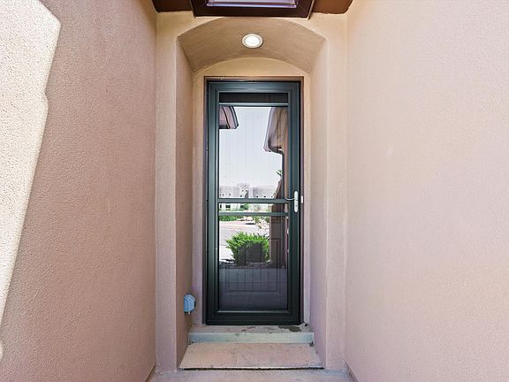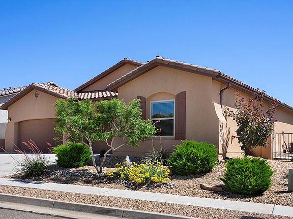 MOVE-IN READY AND ELEGANT RIO RANCHO BEAUTY features 3 bedrooms and 2 baths, with a primary suite offering a 3/4 bath, dual sinks, and a walk-in closet. The modern tile throughout and glass storm doors enhance its contemporary charm, and get ready to relax on the large covered patio with a gas stub out, perfect for gatherings! Beautifully landscaped front yard enhances your curb appeal and the spacious backyard, with a small view, includes $5K in landscaping and $7K in concrete work. The gourmet kitchen boasts a built-in gas cooktop, double oven, bright tile backsplash, large island with sink, pantry, and quartz countertops. The LG dishwasher is only 6 months old. The 3-car garage features ample overhead storage and a utility sink. Don't miss this opportunity!