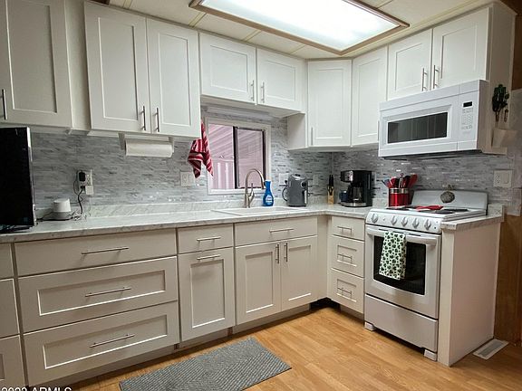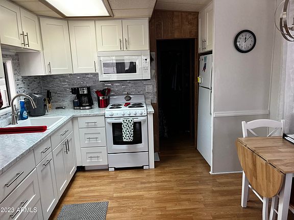 This Charming 1 bed // 1 bath Single Wide Mobile Home is Perfect! Recently remodeled kitchen & bath, brand New Microwave, Stove, Washer & Dryer. Roof Coated & Sealed, Fresh Exterior Paint, Sunscreens & Blinds in 2022. Situated in this Active Adult Community of Apache Wells RV Resort with many organized activities and amenities for you to enjoy daily. (See the list in the documents section). You can move right on in, most all of the furniture is included. Make this Awesome Home your Winter Retreat, your investment property to rent out or your Year-round Residence! Buyer has access to all CalAm resorts and amenities. Park approval required, $50 background check.