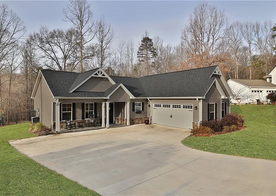Welcome to your own lake front home! This newer construction, stepless ranch home is the perfect primary home, lake "weekender," or investment property. The home has one of the most gentile walks to Lake Lanier that you can find at any price point. The property backs up to corps property and one portion leads right up to the lake with very little buffer. Although the lake is extremely low due to the work being done on the damn, you will see how beautifully close you are the lake. Image evenings in the hot tub, watching the sunset over Lake Lanier! Inside the home, you will find a space-maximizing, open-concept floorplan. The spacious kitchen offers stainless appliances, white cabinets, granite countertops, and a large eat-in island. The over-sized family room features a beautiful stone fireplace and huge windows to bring the outside in. On one side of the home, you have a spacious owner's suite. The owner's closet features a brand-new custom closet system to maximize space and the spa-like bathroom will WOW you! On this side of the home you also have a spacious laundry room and 2-car garage. On the opposite side of the family room, you will find your two secondary bedrooms with large closets and shared full bathroom. Throughout the home, you will find the floorplan maximizes useful space. But, the best feature is the huge yard with covered patio, hot tub, and storage shed. Walk straight out of the fenced yard to famous Lake Lanier. This is the perfect place to launch your kayak or jet skis. This property is truly heaven on earth! Welcome to the Lake Life!