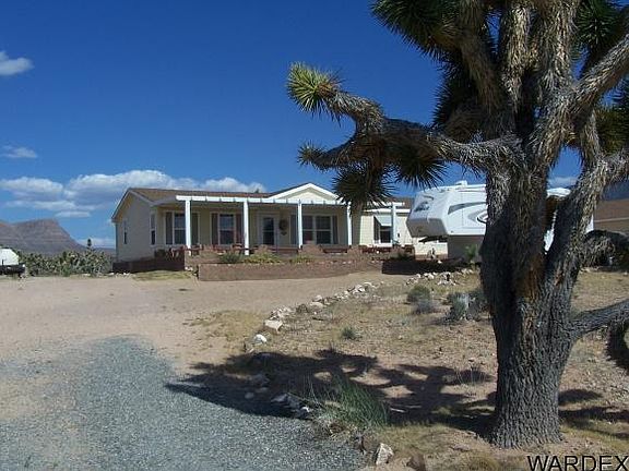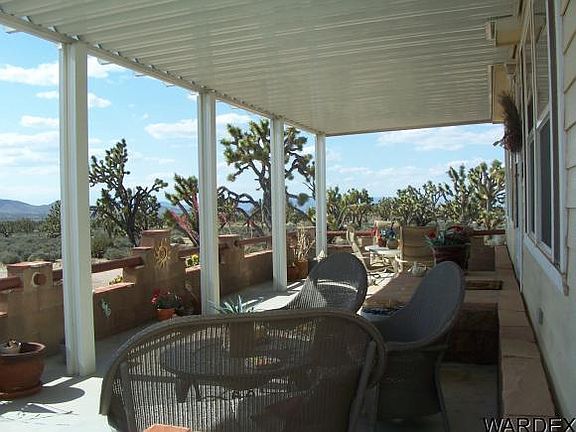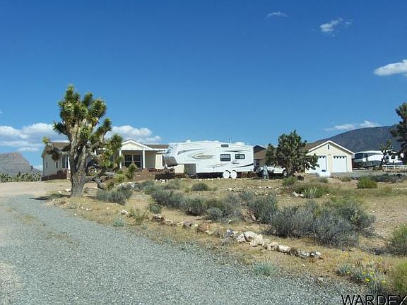 Nestled in a Joshua Tree Forest, this lovely 3Bed/2 Bath Home shows like a model! Exquisite Front Covered Patio Entry leads into over 2300 Sq Ft of living space with Great Room plus Huge Family/Recreation Room with Fire Place and Den/Office. Vaulted ceilings, ceiling fans, wall to wall carpeting and custom colors provide warmth throughout. Open Kitchen with casual dining area. Large Kitchen Island and plenty of Cupboards. All appliances stay. Large Master Suite with dual sinks and separate Garden Tub/Shower. Double Sliders from Dining Area and Family Room lead to extended sand stone patio with two seating areas for awesome views of the Grand Wash Cliffs. Detached 3 Car Garage with Work Shop and garage door openers. Private Patio area off of garage for extra entertaining enjoyment. Two lots make up 2.3 acres total. Near Launch Ramp at Lake Mead for fishing and boating. Club house available with pool, tennis and more.