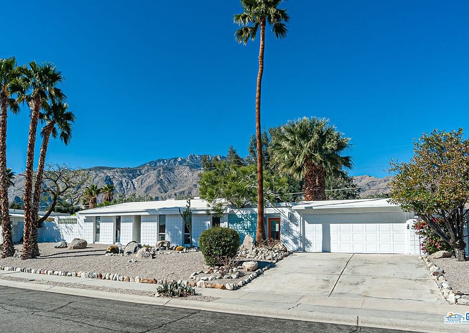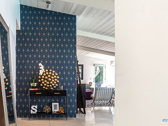 Live the true midcentury modern lifestyle in this classic Palm Springs residence built by the Alexander Construction Company. Constructed in 1960, it was taken down to the studs in 2006 and every major system was completely replaced including electrical, plumbing, air conditioning, furnace/heater, drywall, sliding doors and windows. Other improvements include fresh paint in 2020, pool refinishing in 2012, refreshed roof in 2015, brand new pool heater in 2022 and new pool pump in 2016. Poured Terrazzo floors were added throughout entire home giving it that genuine mid-mod feel. Unique walnut wood paneled "POP" wall in living/dining room gives the room warmth and style. Roof line allows pitched exposed beam ceiling in every room. Living/dining room features a cozy fireplace and backyard the has expansive western mountain views. Upgraded bathrooms feature Italian tiled walls, custom vanities and designer fixtures/faucets. Fully integrated sound system including bedrooms and exterior speakers. Designer kitchen with professional grade appliances, European cabinets and new solid surface counter/backsplash. Fresh landscaping, irrigation, and outdoor lighting added in 2018. Step out from the primary bedroom onto a large, privately landscaped patio and clean up in the al fresco shower. Located on fee simple land (no Indian land lease, it makes for a fantastic primary, secondary or vacation rental investment with no HOA and no minimums for rental periods.