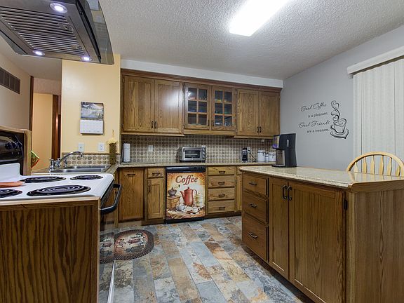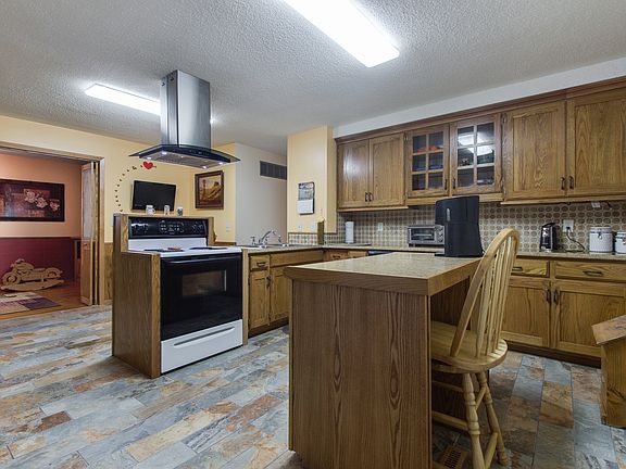 The covered front porch offers a choice of entering either through the main door to the home or a separate door to the home office. This three bedroom, 3 full bath home includes two wood burning fireplaces, living room, formal dining room, oversized kitchen, full unfinished basement, main floor laundry room, home office, double garage, and two storage buildings, situated on a 1.66 acre lot on the Little Arkansas River. Formal Living room has new Frieze carpet and one of the two wood burning fireplaces. The home The home includes Kansas sandstone. ...a great view of the terraced yard overlooking the river. Just off the living room is the formal dining room, complemented by two built-in china cabinets and more new carpet. The large kitchen includes the second wood-burning Kansas sandstone fireplace, an island complete with breakfast bar, and new laminate flooring. It is currently set up with table and chairs, but this kitchen could be furnished with TV and seating for entertainment. Just off the kitchen is the Home Office with newly refinished oak floor, separate entry door, and a full bath. Through the kitchen is the door to the basement, and the main floor laundry with 220 hook up and upper and lower cabinets for plenty of storage. The laundry room opens conveniently to the garage. The same size as the home, less the sunroom, the 1809 sq ft unfinished basement is full of potential. The two car garage has one automatic garage door and flanked by an attached storage shed. The sun porch is spans the length of both the kitchen and living room, and is not included in the finished sq ft listed. The master bedroom also has newly refinished oak floor and a full bath. The second bedroom has newly refinished oak floor, while the third bedroom has new carpet. Between these two bedrooms is a large full bath. Two storage buildings, one next to the garage and one on the second level, provide plenty storage. The barn shaped building located on the second level of the back yard has a plywood foor and could easily be converted to a workshop. The lot is 1.66 acres. It is terraced and irregular in shape, being narrower near the house and wider along the river, with the longest river-frontage on the market. Homeowners along this stretch of the Little Arkansas own to the natural middle of the river. Fresh paint thoughout the main level and new or newly refinished floors mean this house is move in ready! Seller is related to the agent.