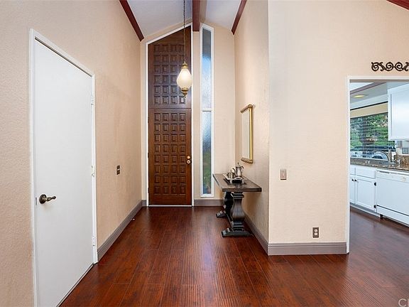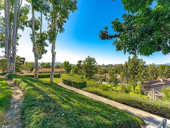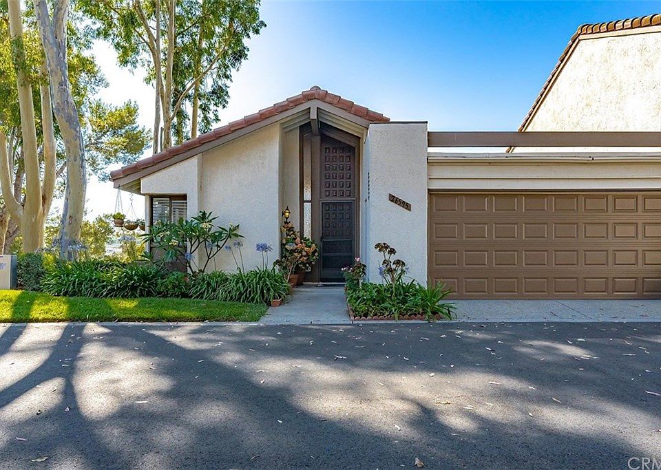This beautiful home is located in a private Cul-De-Sac street with a great view of trees, greenbelt, city lights and hills. There are only 9 homes located in this unique location of La Mancha community. This home looks like a single family (detached from 3 sides) and offers open floor plan, cathedral ceilings, tall windows, hard wood flooring throughout, and is light and bright. Entrance is at ground level and you enter in foyer opening to dining room and lovely kitchen. Step down (only 6 steps) to living room with gorgeous fireplace and opening to a view private deck. Large master suit and second bedroom are in the same level. You will have direct access to two- car garage with storage plus an assigned parking space. This home is partially furnished, and the owner is leaving a 53a TV mounted on the wall of the living room, a nice queen bed with a drawer, a console and beautiful mirror for the foyer. La Mancha community has several walking trails, 2 community swimming pool, and is surrounded with lots of trees/greenbelt. Great location close to markets, Trader Joeas, and many more. Easy access to I-5 & 241 FWY.