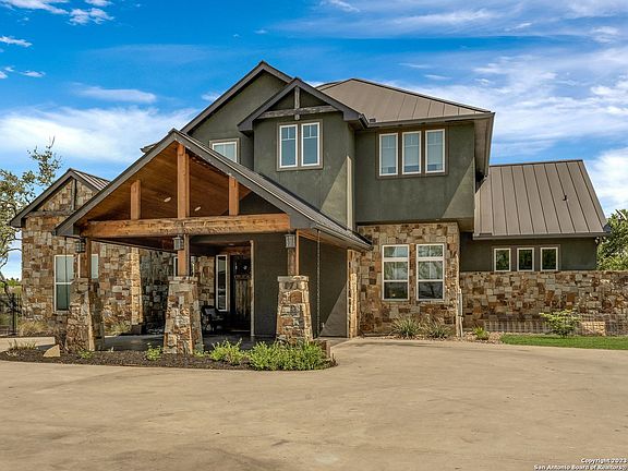 Resort style living on 1.5 acres with spectacular views, Keith Zars ozone pool/hot tub and beautiful oak trees located in the rustic and sophisticated beauty of River Crossing in the Texas Hill Country! A unique approach of entering the property on the long driveway and parking in the porte-corchere illustrates how privately situated the home is established. The extraordinary natural materials and quality finishes define this 4,276 square foot home, with four bedrooms, three full baths, one-half bath, a formal living room, a custom gourmet kitchen with gas cooking and island seating for seven, and formal dining with endless hill country view. Upon entry, you are invited to a large open foyer that introduces you to the ambiance of the home. The home designer colors and details, Marazzi Italian tile, an abundance of natural light throughout, and a thoughtfully curated floor plan to capture this one-of-a-kind River Crossing beauty. The primary suite is complete with views of the pool and hills, cathedral ceiling, and a luxurious primary bath with spacious dual vanities and custom walk-in closets with access to the laundry room. Smartly designed split plan offers a spacious secondary bedroom with a full attached bath with shower and walk-in closet on the main level. Covered veranda off the living and kitchen offers inviting spaces with miles of views for outdoor entertaining and dining, rain or shine. Additional features include two secondary bedrooms with a Jack-n-Jill bath, a private office surrounded in built-ins with pool and landscape view, secondary living room space perfect for personal reflection, TV or game room, flex nook area for crafting or second office, laundry room with storage, fridge/freezer space and sink and so much more. The Keith Zars custom pool and spa with heating ability are well-positioned behind the house taking in the full beauty of this property. Complete privacy surrounds the pool, allowing for true serenity when gazing out to the hill country. The idyllic landscape design includes a fire pit patio for those starry nights, oaks and mountain laurels, outdoor gardening space for those with a green thumb and a pool deck with patio area to entertain or read a good book. Detached from the main house, is a bonus oversized 4 car garage with storage that includes 220 and 110 electrical and oversized second level storage loft. Room enough for multiple cars, boat, camper and/or other recreational vehicles and hobby space. River Crossing is regarded by many as a premiere golf and river community. Award winning golf course offers private social and golf memberships. River Crossing community includes private river park access to enjoy picnics, swimming and kayaking. Also available to neighbors are a sports court and covered pavilion for get togethers. This home and community is nothing short of magnificent at every turn.