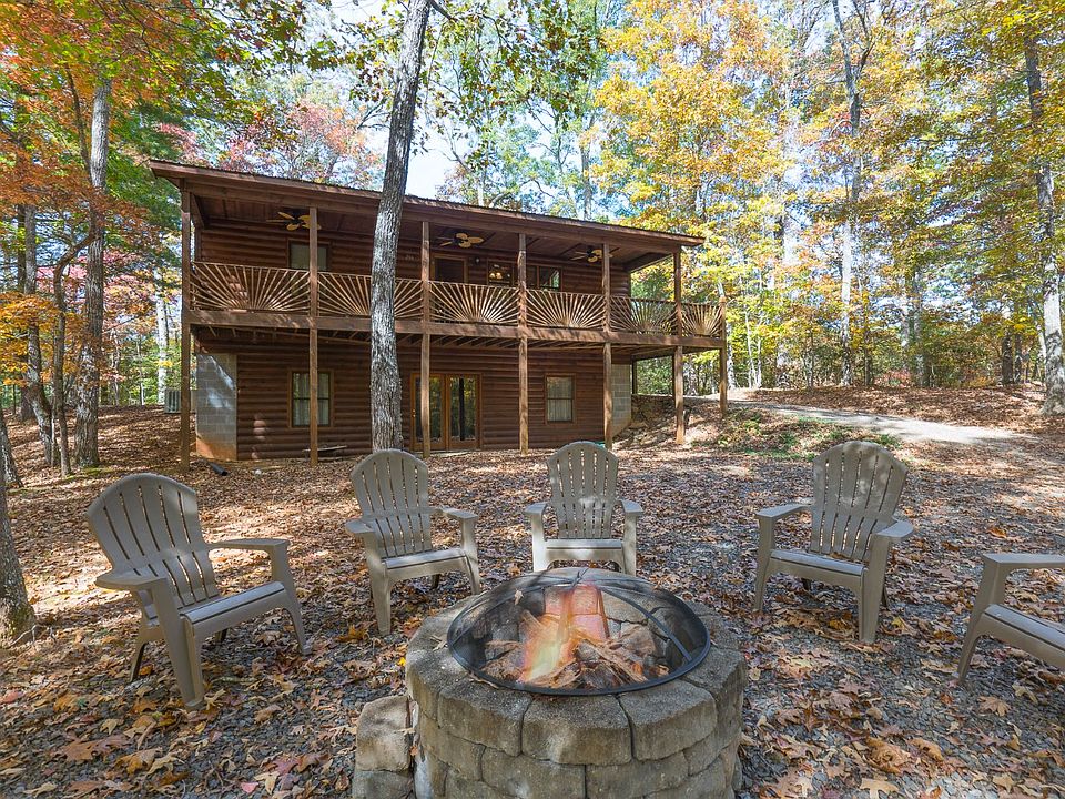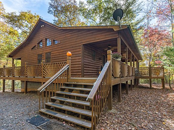 You will love this custom built fully furnished cabin as much as the original owners who designed and built it do. The way they have cared for it is evident everywhere you look. At first glance you will appreciate the well appointment kitchen with lots of cabinets /pantry space. It opens up to the large great room with vaulted T/G wood ceilings and stacked stone fireplace to cozy up to. Down the hall is the Primary suite with patio doors leading to covered wrap around porch. There is a second bedroom and guest bath on the main level. A full unfinished basement is stubbed for the 3rd bath and is ready to be finished off for additional living space. Would be perfect for rec/game room and 3rd BR/BA. The perfection continues outside, with the cabin perched in the center of the 1.08 parcel so you can enjoy the serenity of the picturesque wooded landscape from either covered porch. Mountain Life at it's best!