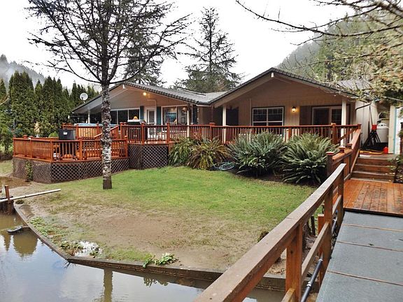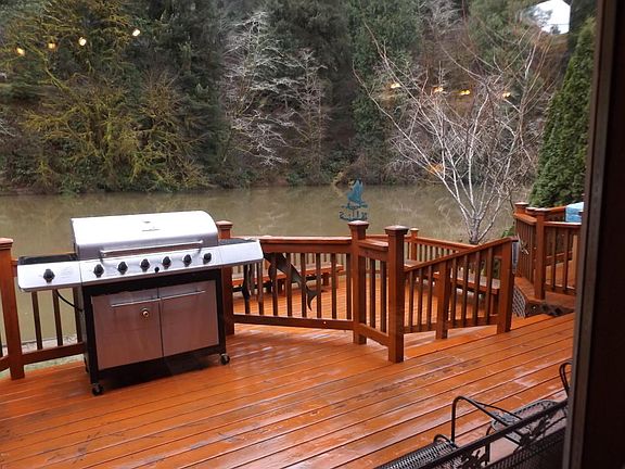 Charming 3 Bed 2 Bath remodeled Riverfront home with views to delight.Home features newer appliances all included,granite counters,hardwood floors,gas fireplace and energy efficient heatpumps.Beautiful decks,hot tub and separate quest house with covered walkways and ADA assessable.Covered boathouse with water & electric located on deep water.Fenced & room for all your toys.