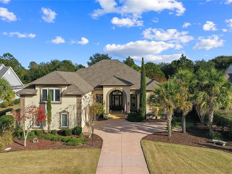 This custom home was built by Tom Peeples with no detail overlooked. The quality and craftsmanship are evident with dramatic coffered ceilings, beautiful custom bar, extensive molding, walk-in closets with wood shelving, and large windows with Hunter Douglas blinds. The primary suite is generous with his and hers closets. Two ensuite bedrooms are on the main floor as well as an ensuite bedroom upstairs. Enjoy expansive views of the Pete Dye golf course from the back porch with the tranquil sounds of the water fountain. This idyllic home is in Hampton Hall, a gated community offering natural beauty, upscale amenities, and a vibrant lifestyle.