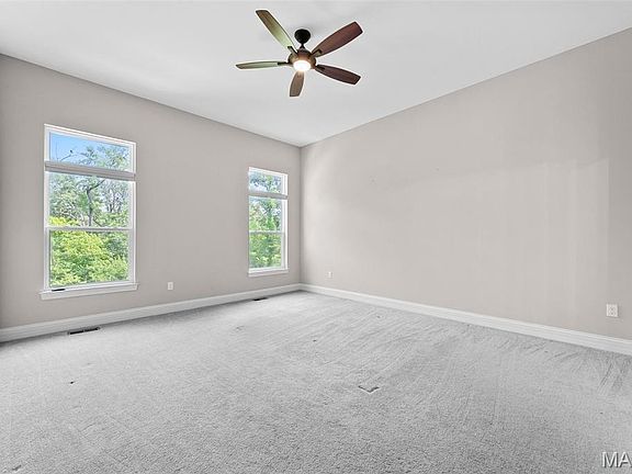 Spectacular, free-standing villa on a .47 AC cul de sac lot backing to trees! Enjoy the space, privacy and luxury of HOA maint grounds and snow removal (per C&Rs). Stunning executive villa in the desirable Keaton Wood neighborhood conveniently located in OFallon near restaurants, med facilities, services, rec & easy access to Hwys 40/64 & 364. There is outstanding curb appeal w/brick-stone façade, O/S garage, carriage style gar doors, arch shingles, landscape & lawn irrig. Features inc 3 BD, 3 BA, 10 ft clngs, LVP flrs, 8 ft tall doors, gourmet Kit, huge island, W/I pantry, chimney style range hood, 5 brnr gas c-top, quartz c-tops, tile b-splash, staggered height cab w/crown, SS appl, dbl oven, large dining area, FP, Grt Rm window wall, main flr laundry, lux Primary Suite w/walk in shower and raised hght vanities, W/I closets and a walkout LL w/tall pour, Fam/Rec Rm, bdr, bath and B/I bunk beds. Relax on your deck overlooking trees. Approx 2,672 s/f of incredible living space, WOW!