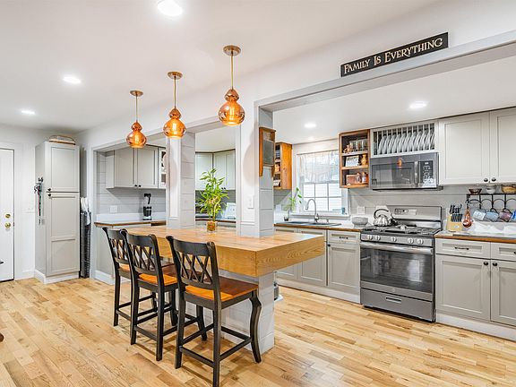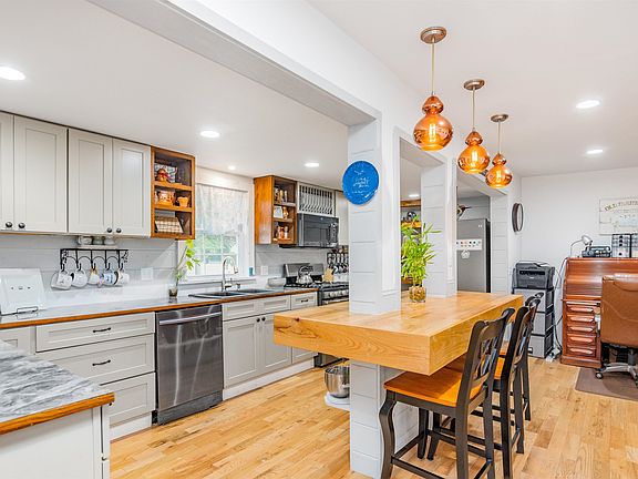 Your investment awaits! This beautifully remodeled duplex with a full first floor unit and second level unit is perfect to owner-occupy, or rent both as an investment property. The spacious driveway gives room for the large detached garage, with finished storage above that could be converted into living space for more income! A heated enclosed porch will bring you into the first floor unit with an enormous remodeled eat-in kitchen & dining space, featuring stainless appliances, a butcher-block island with seating, and new hardwood flooring. A large, fully updated bath off the kitchen houses the laundry and is finished with charming shiplap. The historic details continue in the living room, which has a tin ceiling. Two bright bedrooms, a storage closet, basement access, and access to the covered front porch finish this floor. With a separate front entrance, the upstairs unit is very private from the main floor and has completely separate utilities. This unit features a large kitchen with laundry hook-ups and a full bath, all recently updated. Off the kitchen is a living space and two bedrooms. A small nook with a window at the top of the back staircase adds an office or storage space. Completely move-in ready and with an upstairs tenant already in place, you won’t believe how well-maintained and beautifully updated this 1850’s home is! Room for improvement on rents is present, and with one unit owner-occupied, immediate occupancy is possible. Don’t miss seeing this one!