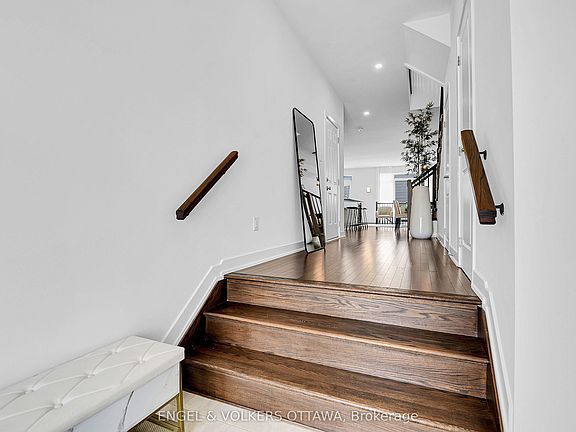 Welcome to 266 Monticello Avenue a stunning Claridge Gregoire model offering 2,160 sq. ft. of thoughtfully designed living space in family-friendly Bridlewood Trails. This highly upgraded townhome is a 10/10 and shows as clean and pristine as a brand-new home. It features a spacious entry with ample storage, and the gorgeous dark hardwood flooring makes a striking first impression. The main floor offers tall 9-foot ceilings, a generous living room, and a dining area illuminated by a new designer light fixture. The upgraded kitchen boasts quartz countertops, stainless steel appliances, upgraded cabinetry, pot lights, and a large island with double sinks and a breakfast bar that can seat four. A large corner pantry is also a welcome feature for many buyers. The entire main floor is flooded with natural light from floor-to-ceiling windows at the back of the home. Upstairs, the primary bedroom is a spacious retreat with a walk-in closet and a four-piece ensuite featuring a glass shower and a soaker tub. Two additional bedrooms, a full bath, and convenient second-floor laundry complete the upper level. The fully finished lower level benefits from an open staircase and natural light. It includes a generous rec room, a gas fireplace, and plenty of storage. There's also a rough-in for a fourth bathroom. Enjoy outdoor living in the private backyard ideal for family BBQs or peaceful evenings. Situated close to parks, schools, trails, shopping, and transit, this elegant and spacious home delivers on lifestyle, comfort, and location. Don't miss this opportunity to own one of Claridge's most popular townhome designs! Some photos have been virtually staged.