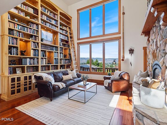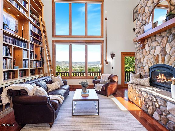 Upon entry, a grand two-story library and living room welcome you with floor-to-ceiling windows framing panoramic views of Heber Valley. The kitchen and dining areas are spacious, accommodating multiple tables and gatherings, featuring a granite island, new appliances, and ample storage. Updates include fresh tile and paint throughout.