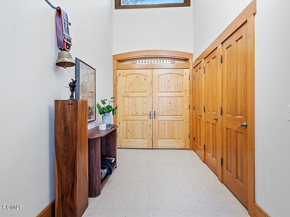 The expansive basement is an entertainment hub with a theater setup, gaming area, gym, bedroom, and bathroom. It opens to sprawling valley views and a pool house with an in-ground pool, bathroom, washer/dryer hookups, and sound system. The south-facing pool wall opens to the deck for summer enjoyment or closes for winter swims. The 3-car garage boasts new epoxy flooring, a workbench, and a storage loft with automated lift, supplemented by a smaller garage for yard equipment. The nearly acre-sized property is landscaped with three back decks and mountain vistas from the front porch.