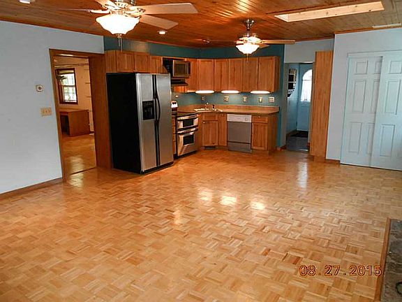 Relax and enjoy the views from the covered front porch Well taken care of and ready to move into lake related home. Less than 1.5 blocks from the lake. This home features an open floor plan with 1240 sq.ft. 2 large bedrooms and 1.5 baths. Parquet wood floors throughout most of home. Fenced in yard and mature trees with that provide plenty of shade. Updated cabinets with stainless steel kitchen appliances. Washer and dryer also included. Professional landscaped. Large 11x23 sunroom with beautiful tile flooring just waiting for your patio furniture. 2 car detached garage with workshop and large storage shed. Extra room in driveway for both pontoon boat and RV. Boat dock available. HOA is voluntary.