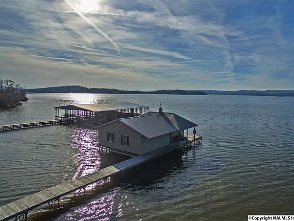 Main Channel Waterfront Home and 3 Slip Boat House in a great location on Lake Guntersville. Situated in a quiet cul-de-sac, on half acre lot with 110+/-ft of shoreline, 3 Bedroom / 2 Bath Home with beautiful open floor plan, vaulted tongue & groove ceiling, Great Room with gas log fireplace, laminate floors, Stainless appliances in the kitchen with large island & bar seating. Large Master Bedroom with it private bath, walk-in closet & lake view, Guest bedrooms with jack & jill bath, lake side screened in porch also with vaulted wood ceiling. The boat house has electric boat and jet ski hoists, roll up doors, covered deck, sun deck and deep water.