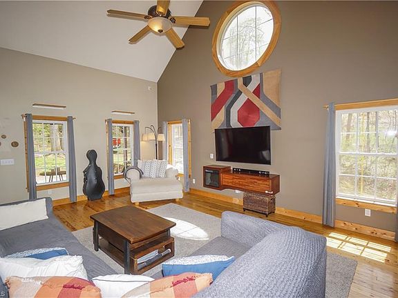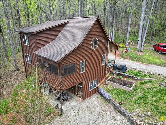 This property offers the best of both worlds; a peaceful mountain escape or a permanent sanctuary. Situated on 7+ wooded acres, this log home seamlessly blends rustic charm and modern comfort. Conveniently located a short drive from Wilkesboro offering both seclusion and accessibility. The vaulted ceiling with a round accent window in the great room floods the space with natural light. Hickory floors grace the main and upper levels, adding to the home's inviting ambiance. The kitchen features custom maple cabinets and stainless steel appliances, refrigerator remains. With a bedroom and bath on each of the three levels, privacy and comfort are assured. Relax and unwind on the main level's screened porch, offering sweeping views of the surrounding landscape, or enjoy the tranquility of the covered front porch. The pellet coal stove in the basement, water treatment system, storage building and chicken coop with laying chickens convey. Propane tank is leased.